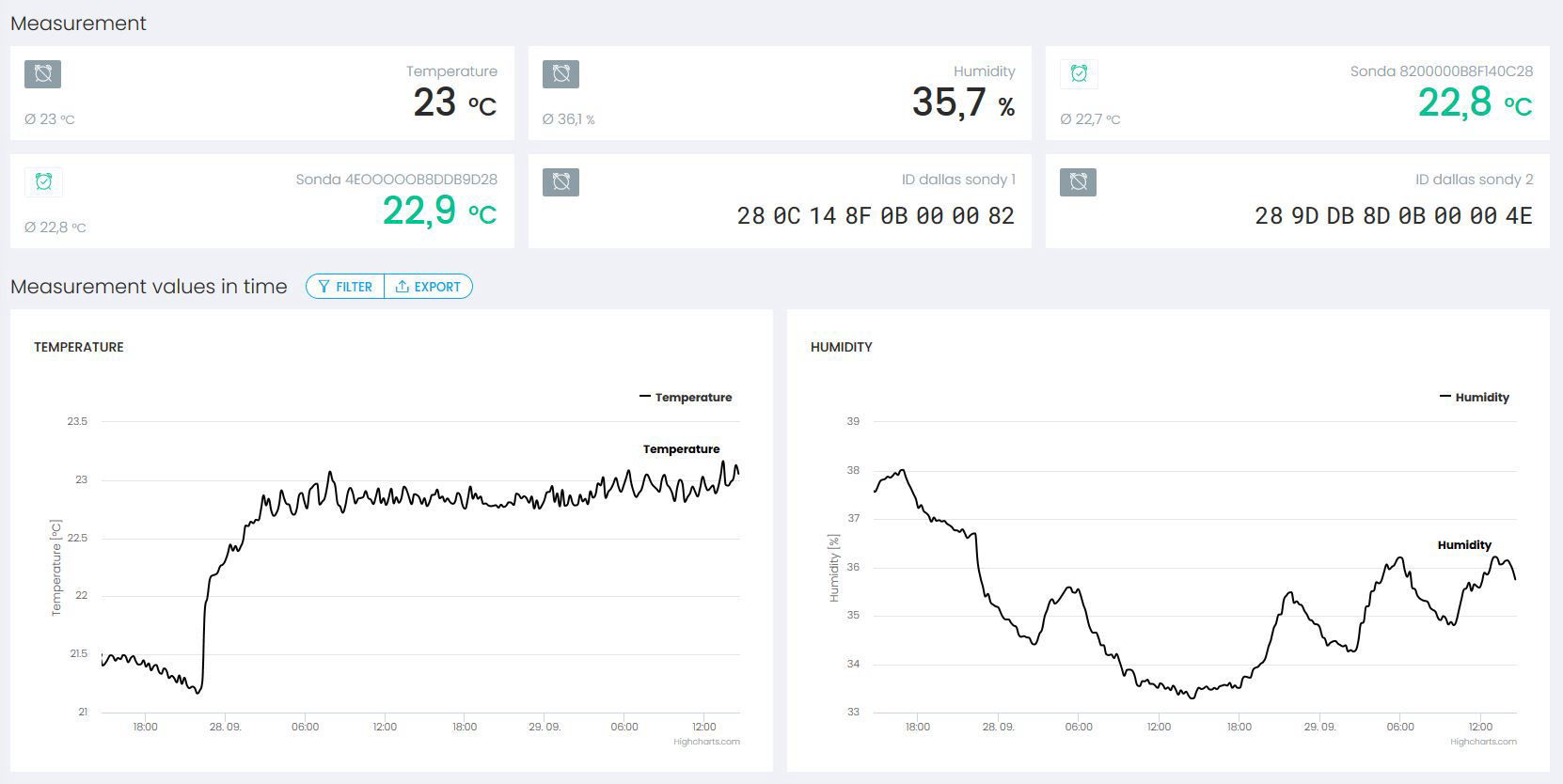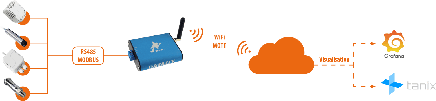 Wireless communication of the devices is based on WiFi communication technology. It is possible to use existing corporate networks without need to install additional infrastructure. RS 485 / WiFi-MQTT DataFly device from Papouch is used to connect to the WiFi network. It is possible to connect several sensors of different physical quantities (temperature, pressure, humidity, CO2, etc.) to one DataFly device. The individual sensors are connected to the device by a wire. The device requires an external power supply, which is not a limitation in buildings. The measurement of individual quantities can be performed at short intervals (from 10 s).