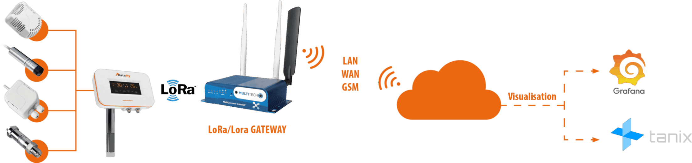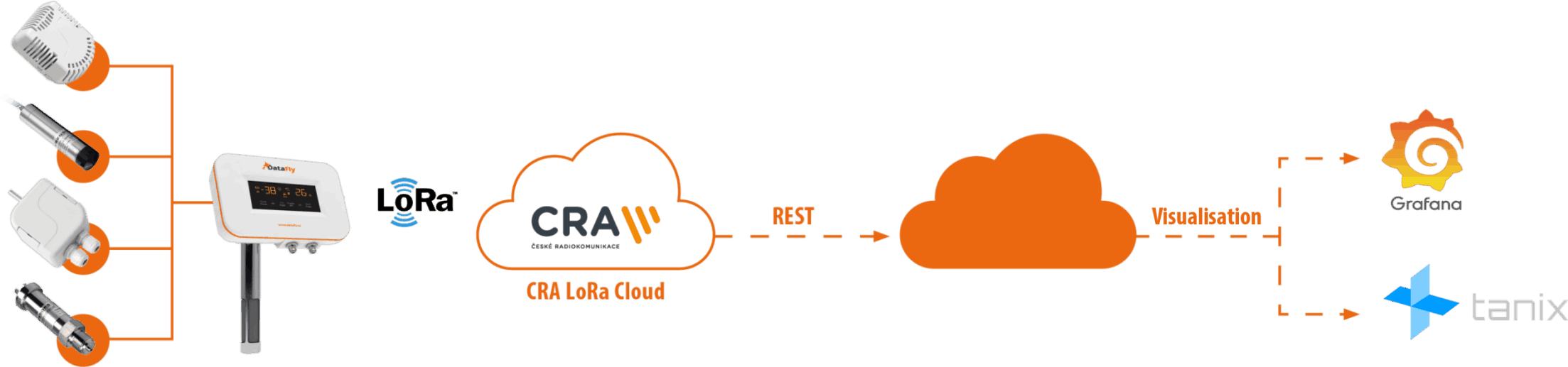 Wireless communication of the devices is based on LoRa communication technology. The LoRa network of the Czech Radiocommunications company covers a large area of the Czech Republic. DataFly IoT Hub-LoRa device from BD SENSORS offers connection of the various sensors to this global LoRa network. Individual sensors of physical quantities can be connected directly to the IoT-Hub via connection connector or by cables through a bushing. The IoT Hub supports internal battery power supply. Measurement of individual quantities can be performed in a configurable interval (from 1 minute) The wider the interval the longer the battery operation lasts (up to several years).